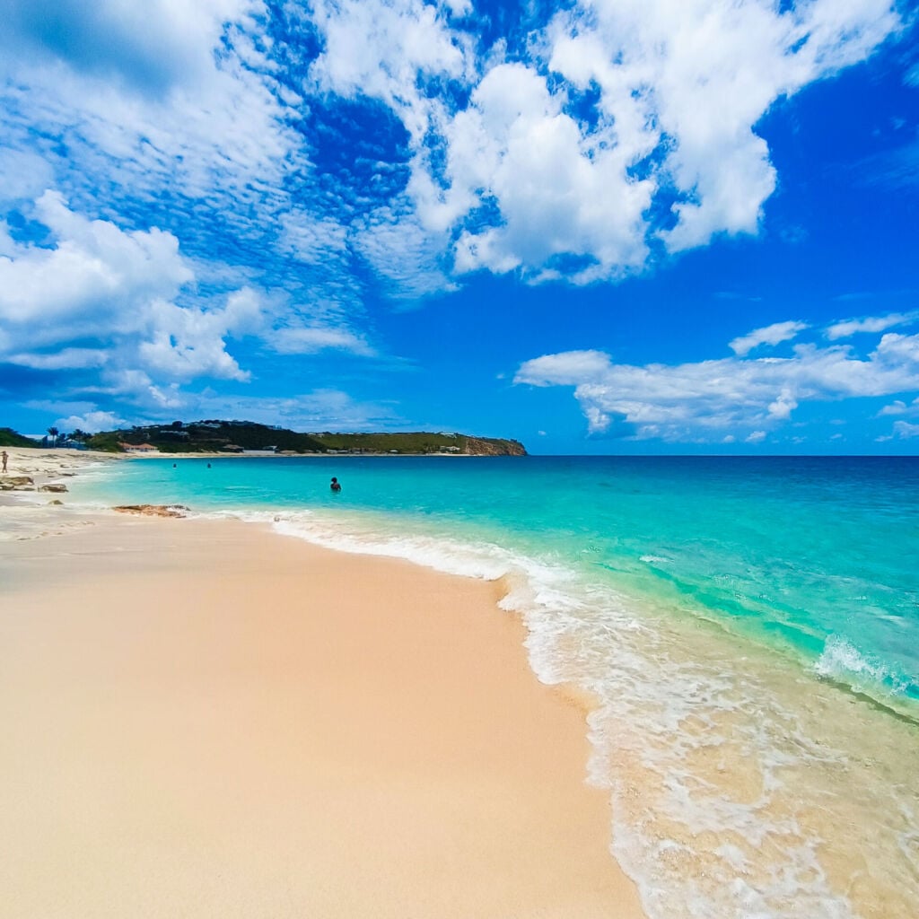 There’s a quiet kind of drama to Baie Rouge. No loud beach clubs. No music competing with the waves. Just a crescent of sand, kissed with the faintest shade of rose, and a sea so still it looks like a held breath. Tucked into the western edge of French Saint-Martin, Baie Rouge feels more like a secret than a destination. The kind of place you arrive to slowly, down a winding road past villas hidden behind palm trees, until suddenly — there it is. A wide, open stretch of beach framed by cliffs and sea grapes, glowing with that impossible Caribbean light.