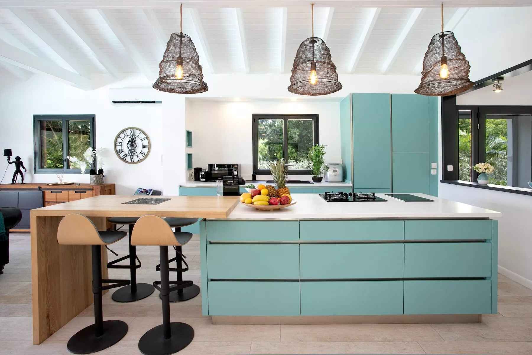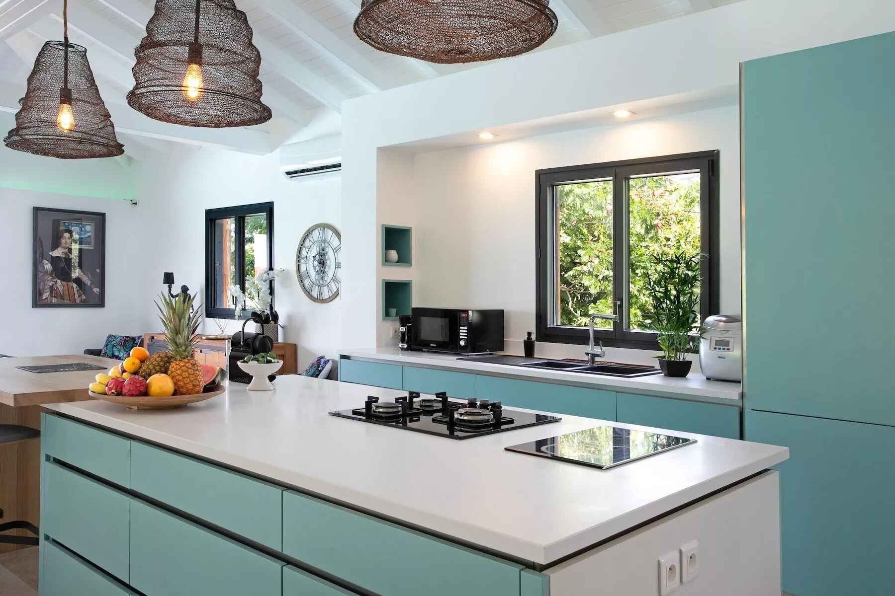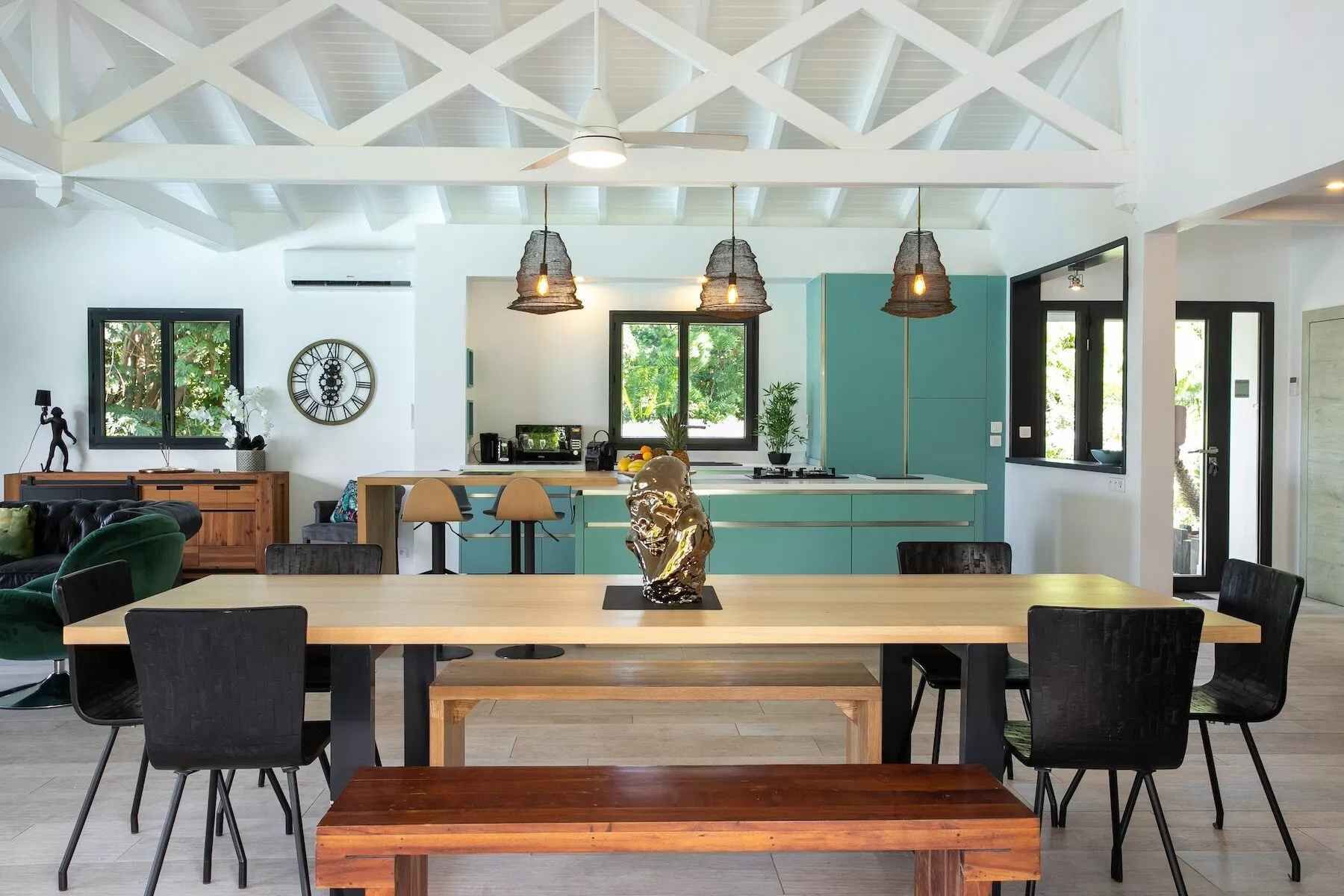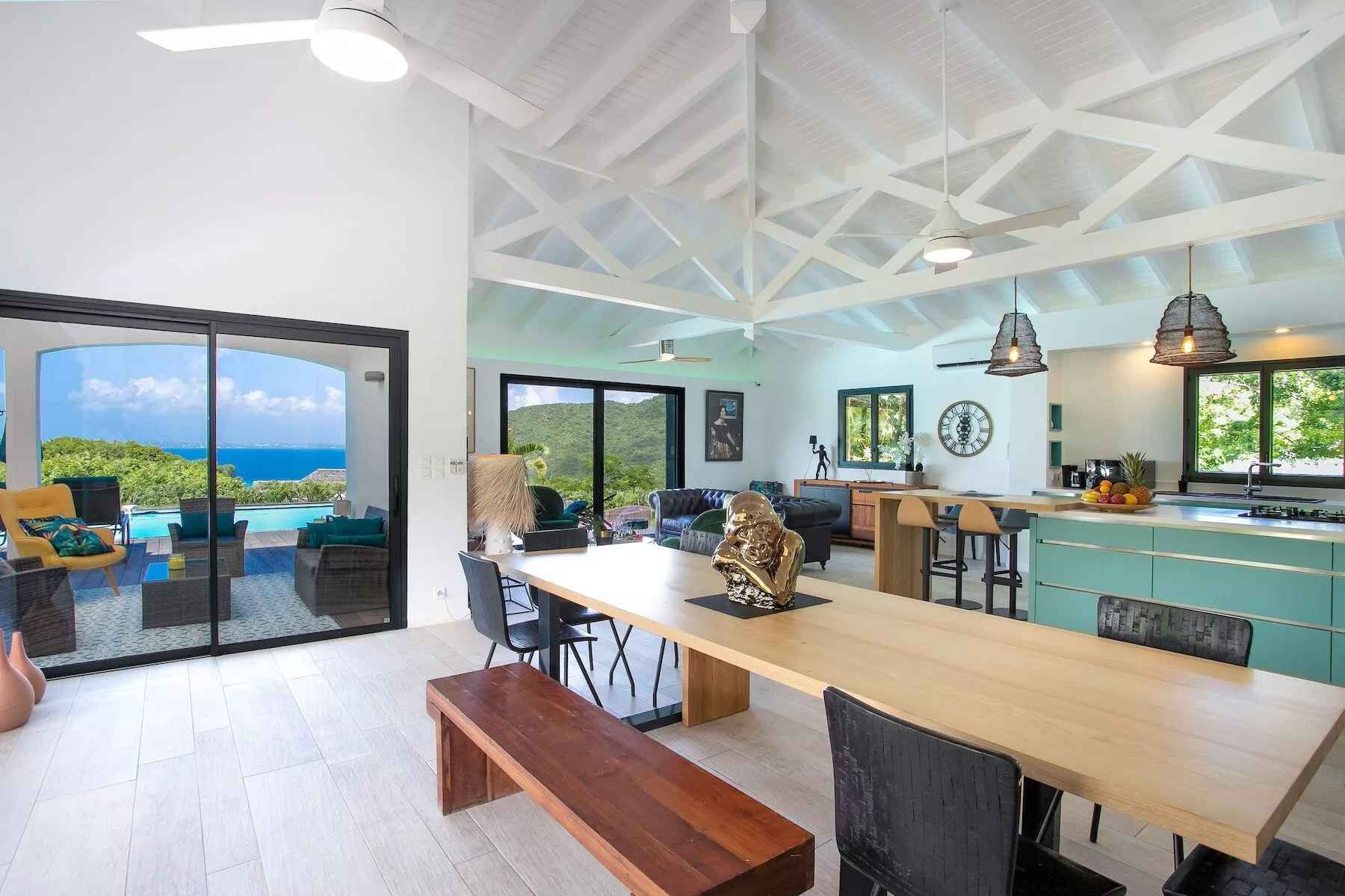 L’espace de vie ouvert est baigné de lumière naturelle grâce aux grandes baies vitrées qui s’ouvrent sur la piscine, la mer, les collines environnantes et le jardin tropical. La cuisine, à la fois élégante et fonctionnelle, s’organise autour d’une grande table conviviale, idéale pour partager des repas détendus en famille ou entre amis.