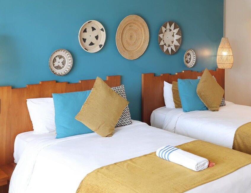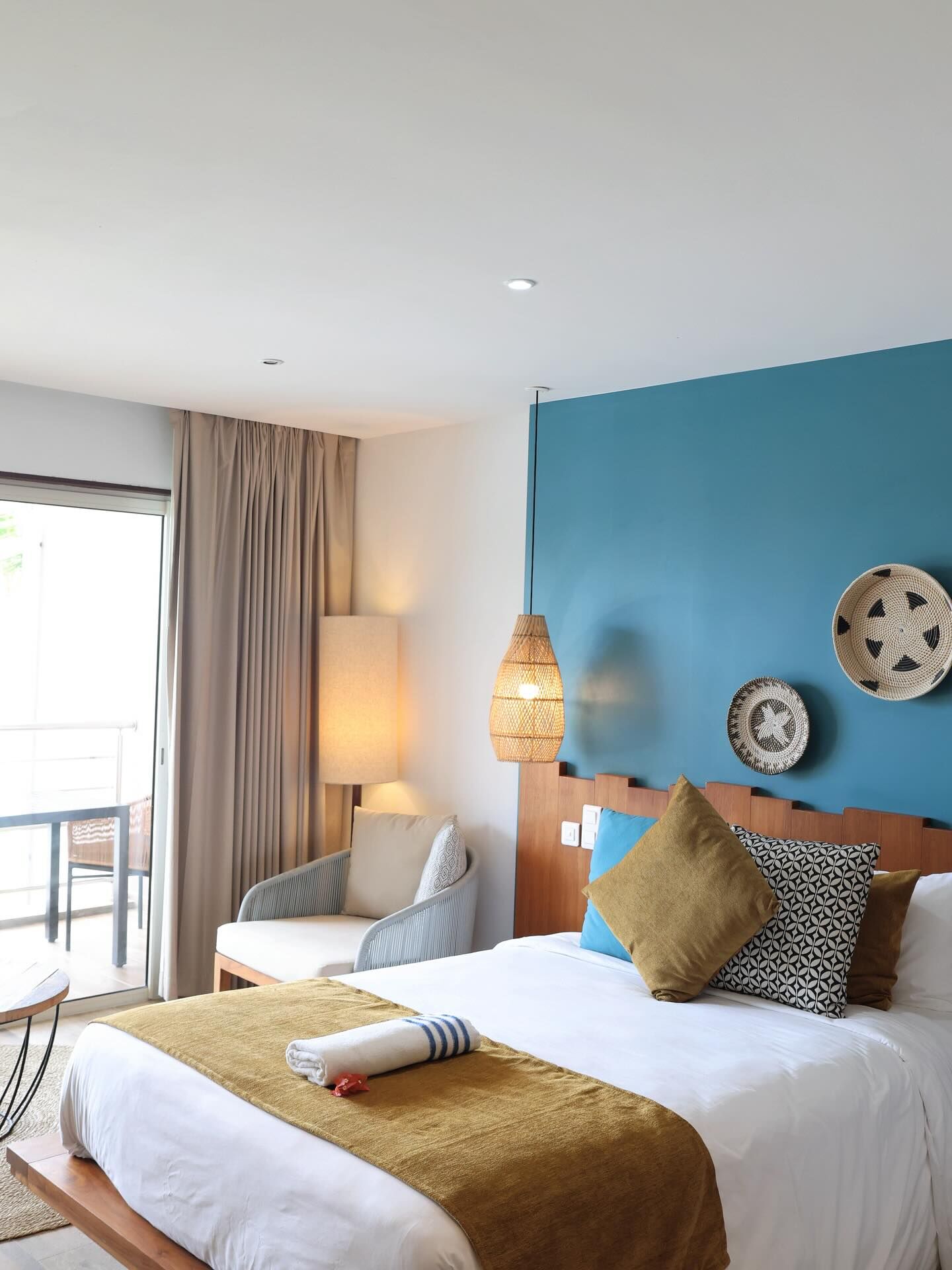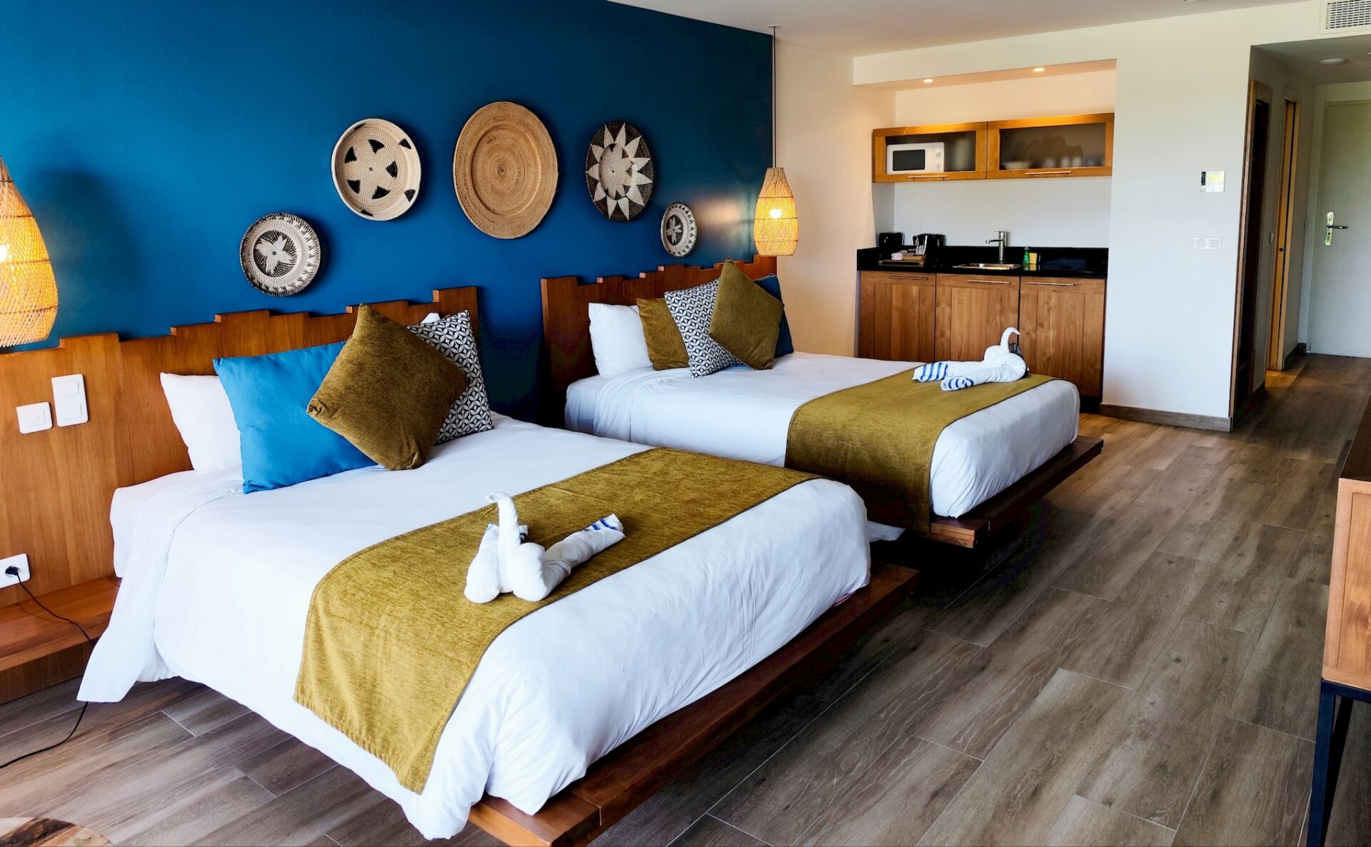 Two full beds guarantee a restful sleep, and the private balcony invites you to gaze out at the turquoise Caribbean. Inside, natural hues and gentle textures evoke a calming, sophisticated atmosphere that feels like home the moment you step in.