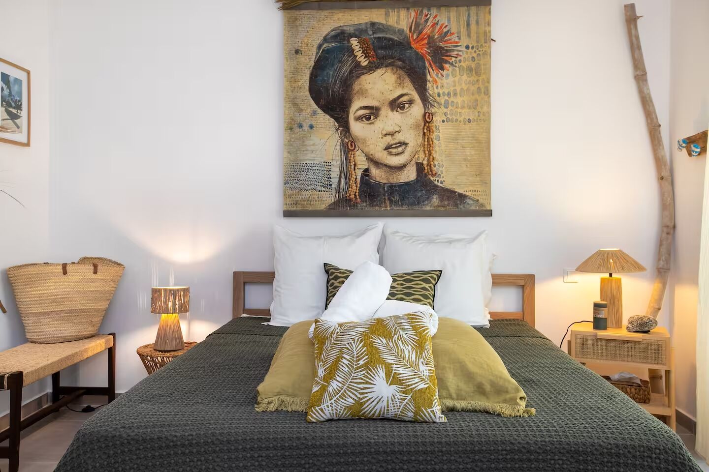 • A cozy bohemian-style living room with a TV for relaxing evenings