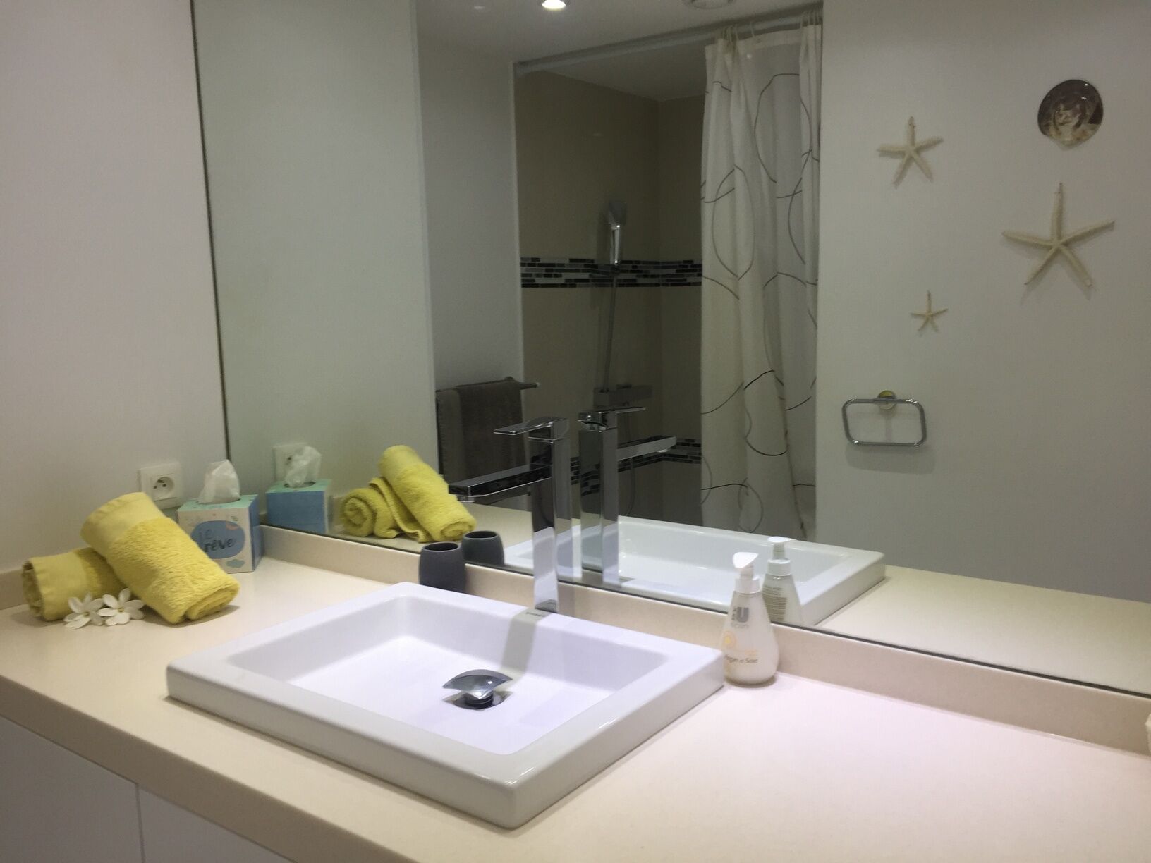 A covered 8m² terrace, fully enclosed by an electric shutter, extends the living space and offers a perfect spot for morning coffee or evening relaxation. A mosquito screen on the sliding door ensures comfortable ventilation.