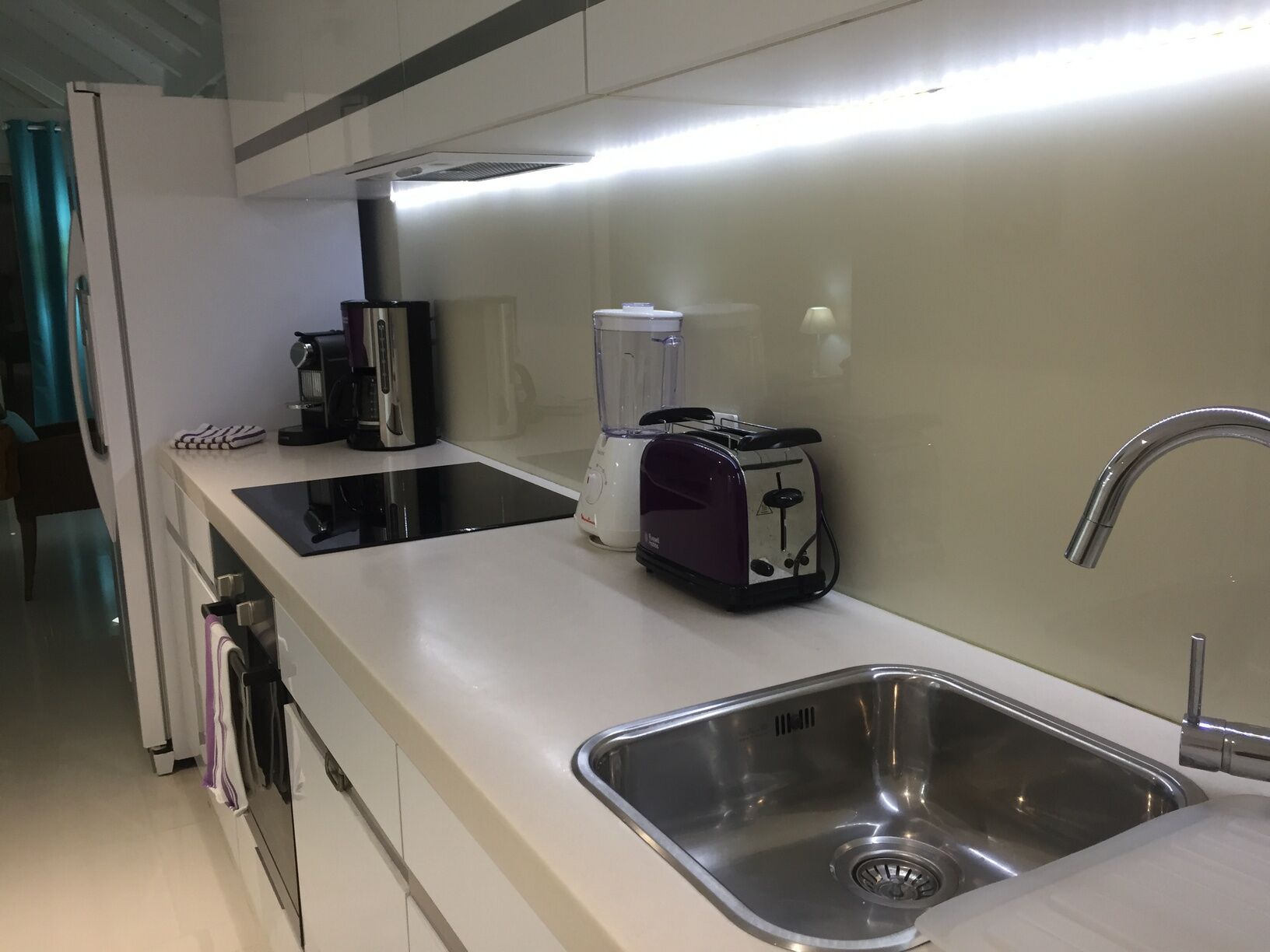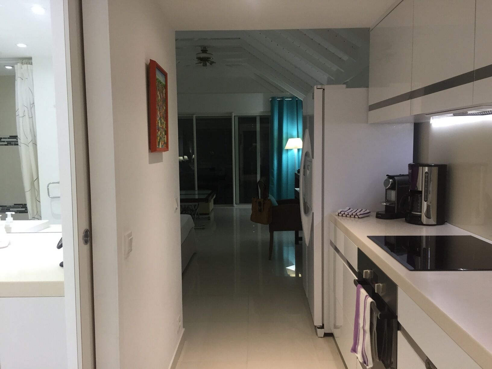 The studio offers a generous ceiling height and a beautifully designed living space featuring a fully equipped kitchen with dishwasher, washing machine, oven, microwave, infrared cooktop, American fridge with ice and water dispenser, Nespresso and filter coffee machines, blender, and toaster.