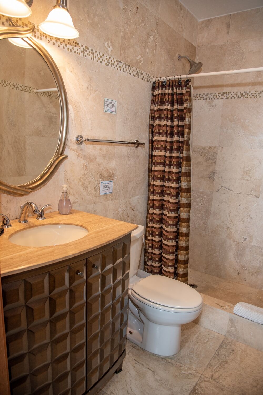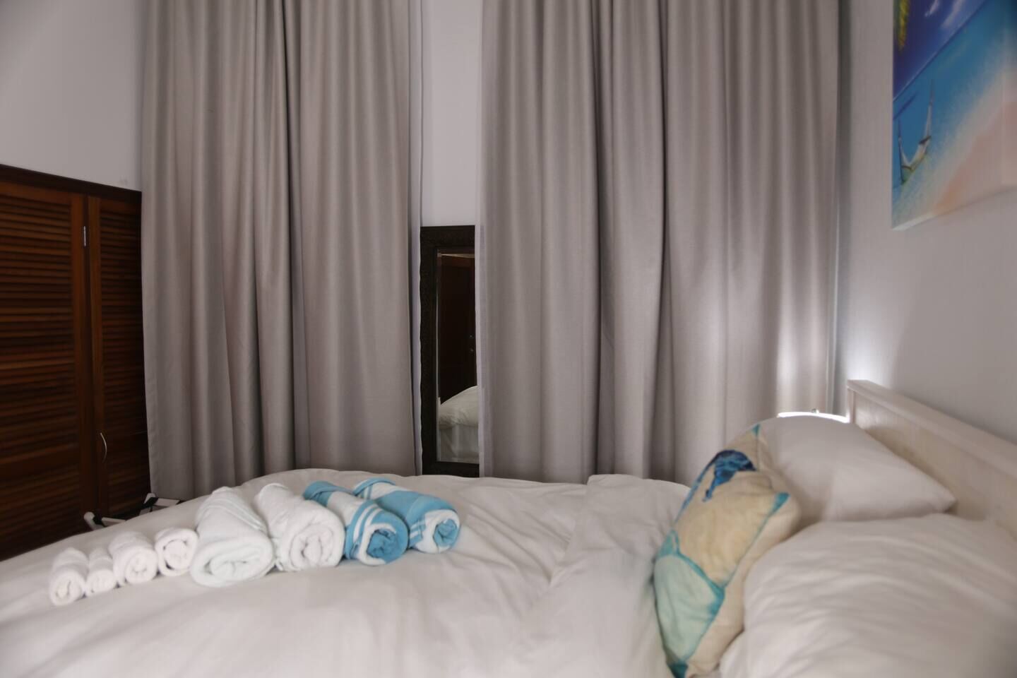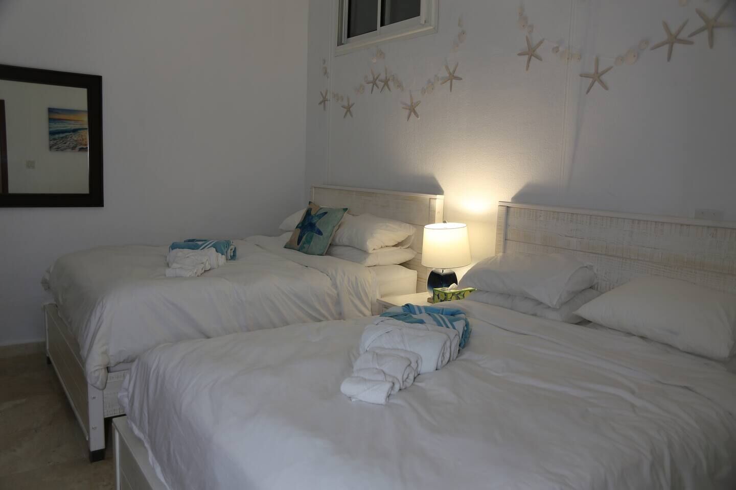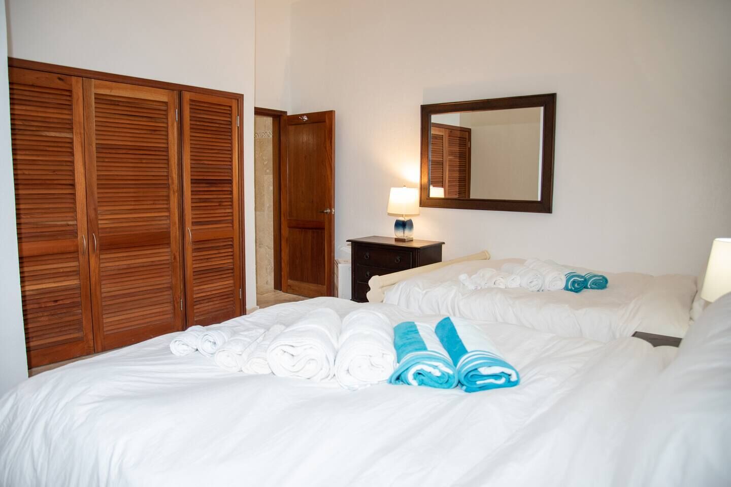 The apartment features two comfortable bedrooms, each with its own ensuite bathroom. The master bedroom offers a king-size bed, bedside lighting, generous closet space, and a beautifully tiled shower. The second bedroom includes two queen-size beds, ample storage, and an ensuite bathroom accessible directly from the room — ideal for families or friends traveling together.