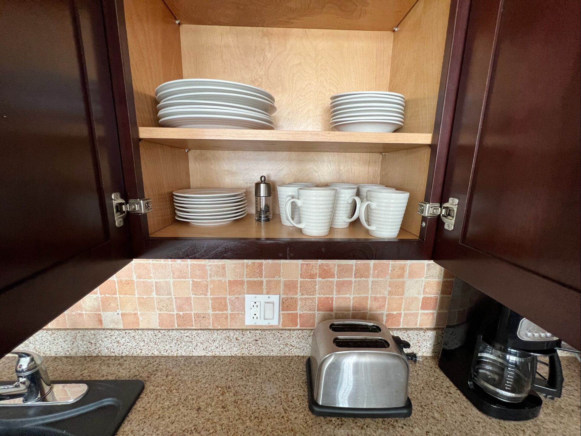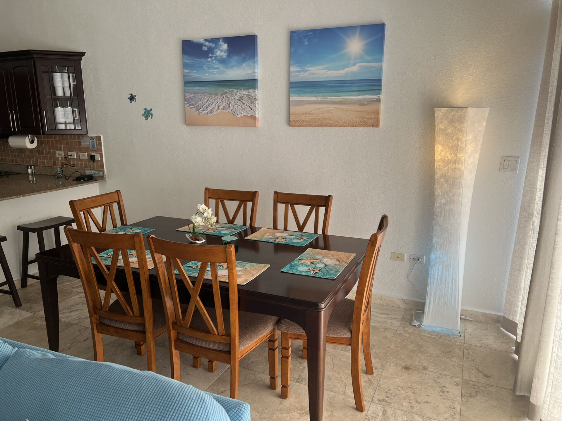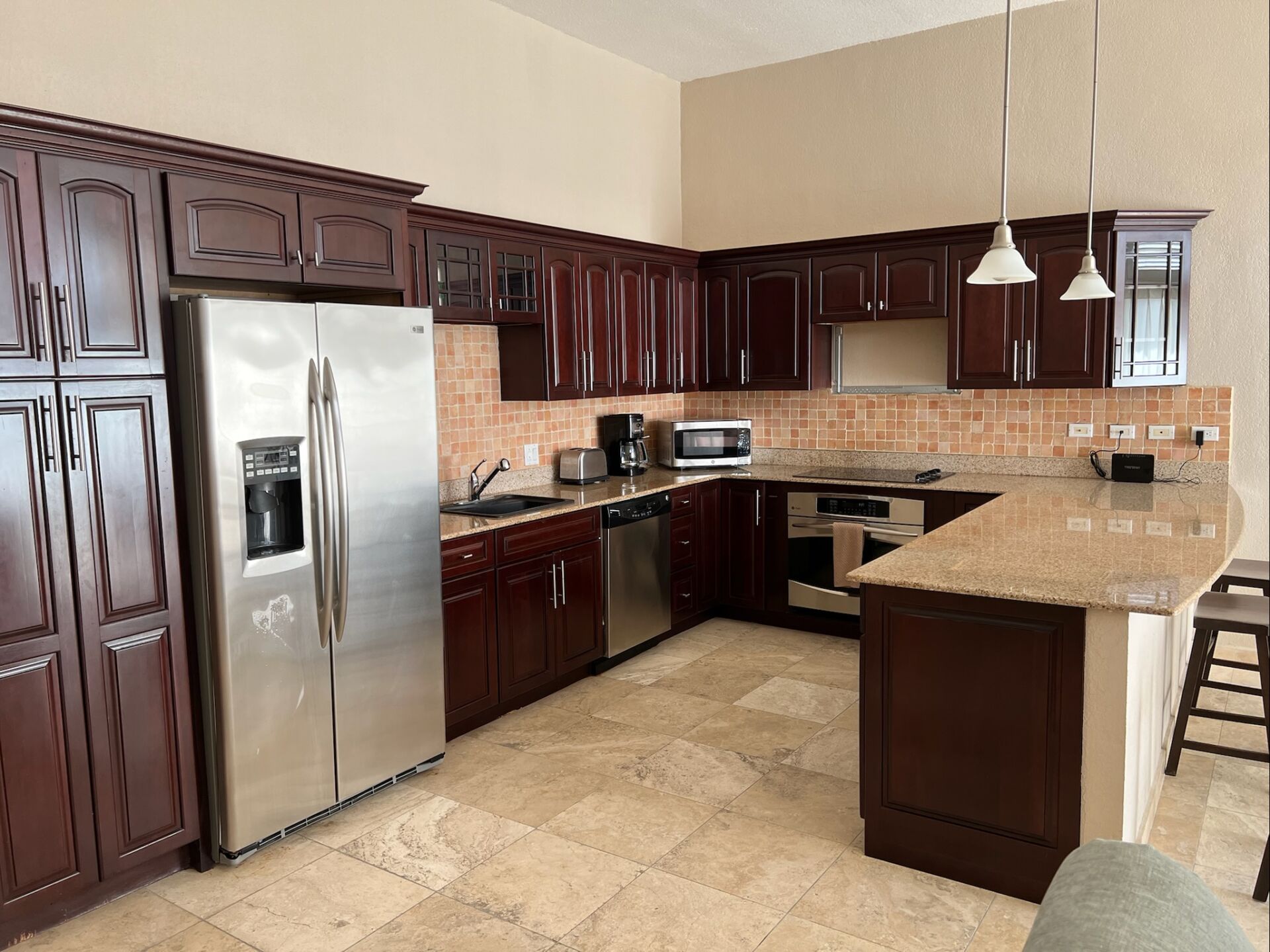 The kitchen is fully equipped and thoughtfully laid out, with everything needed for everyday cooking, including a blender, toaster, and Ninja coffee maker. Bar seating for three and a dining table create a relaxed setting for meals at any time of day.