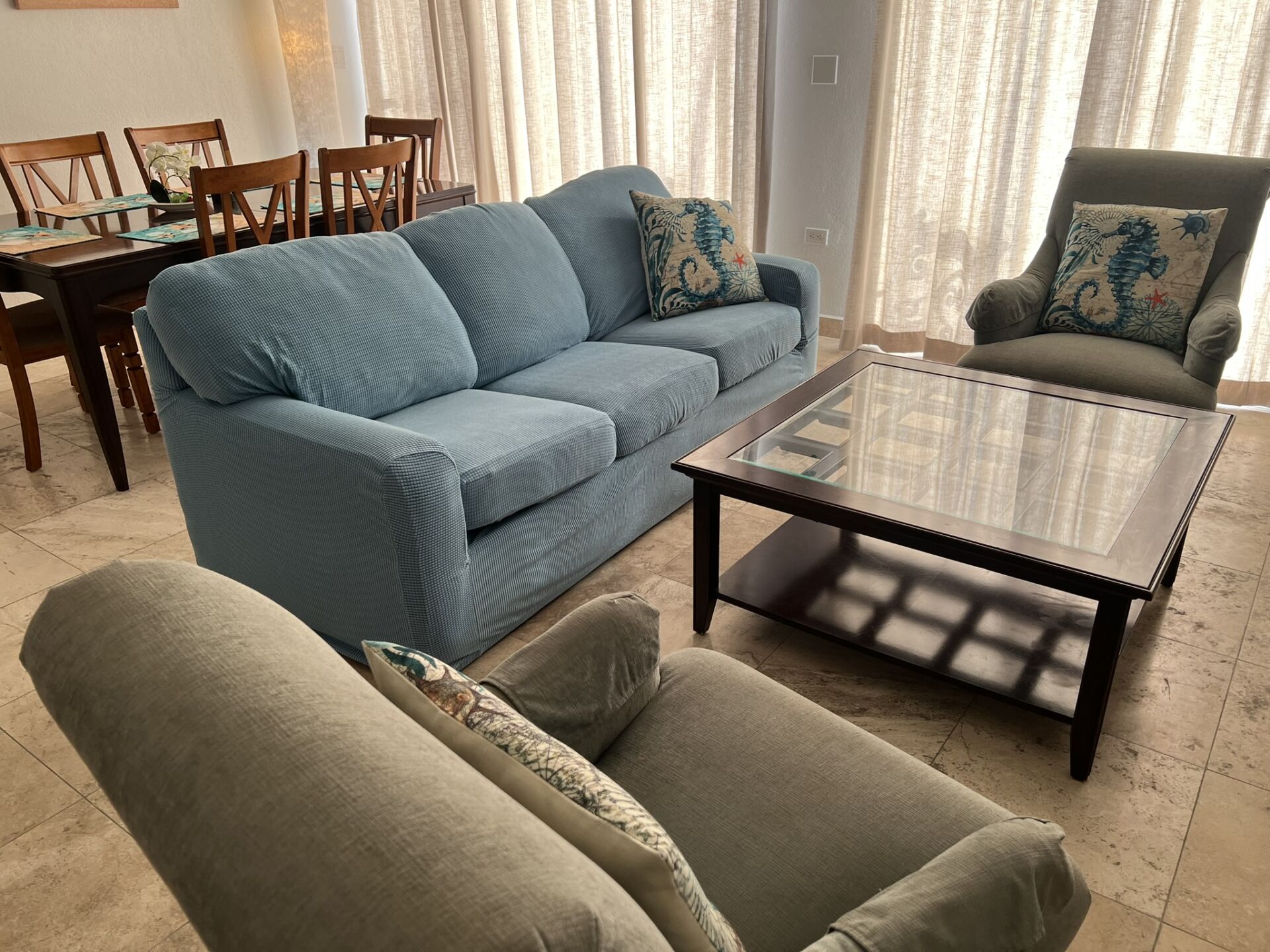 Inside, the atmosphere is calm and welcoming. The living room is arranged for comfort, with a plush sofa, two comfortable chairs, and a smart TV — an easy space to unwind after a day outdoors. From here, step onto the balcony and enjoy open views while savoring a quiet coffee or a good book. The dining area flows naturally from the living space, making it easy to move between moments of rest and shared meals.