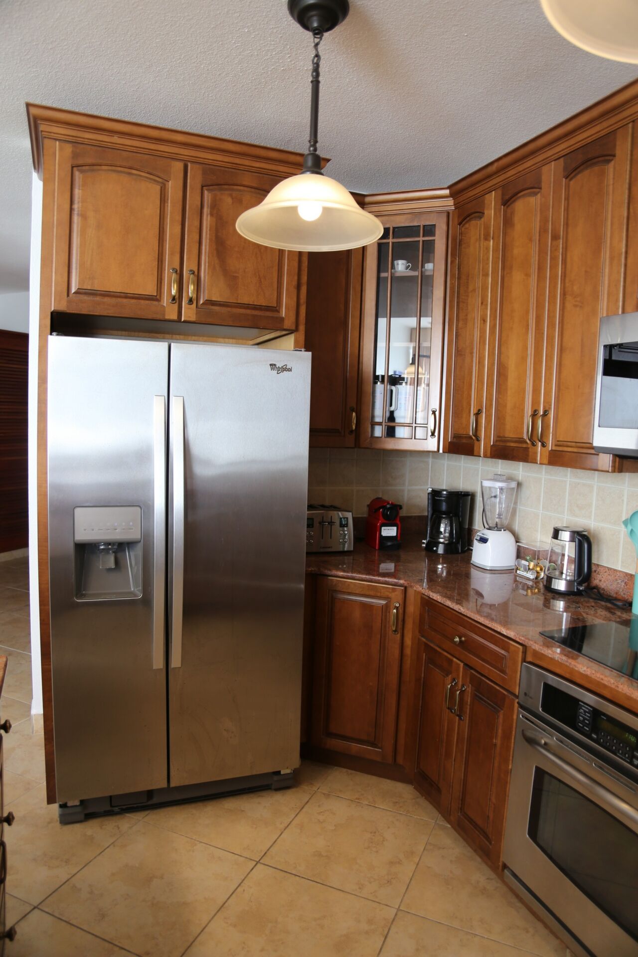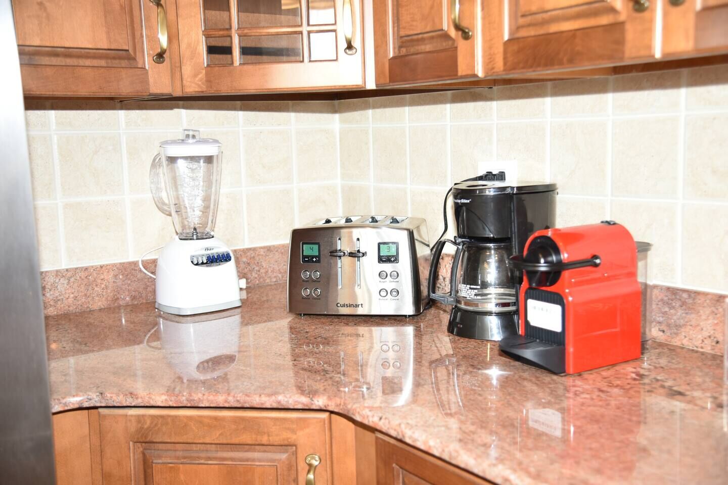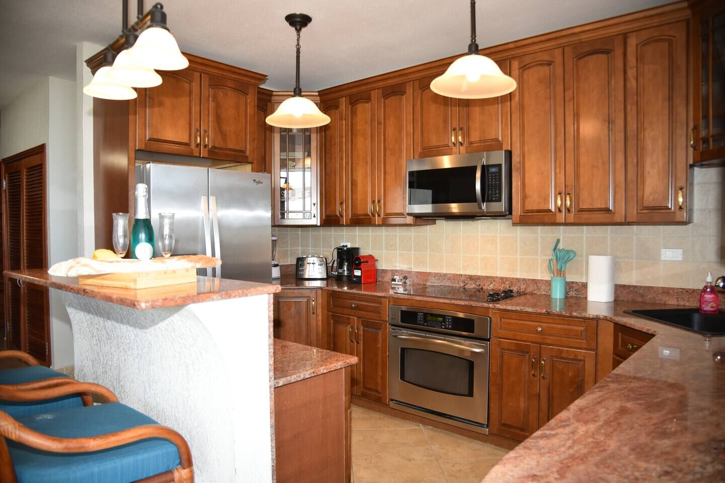 The open kitchen is fully equipped with everything you need, including a stove and oven, microwave, blender, toaster, and Nespresso coffee maker. With generous counter space and a breakfast bar for two, it’s designed for easy cooking and shared moments.