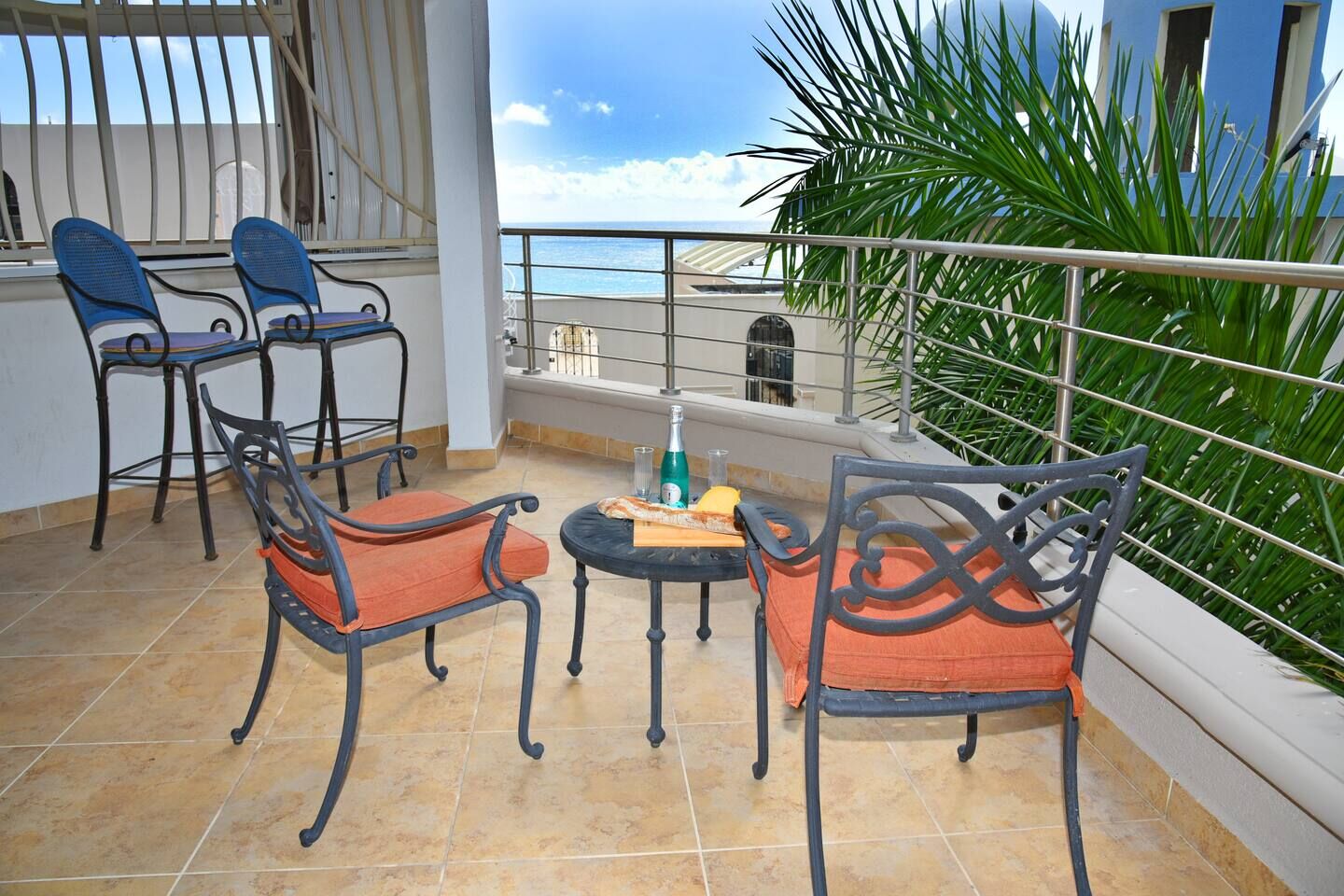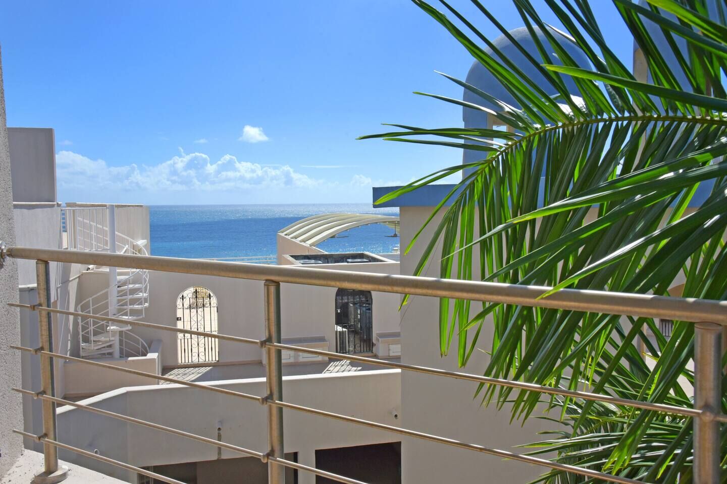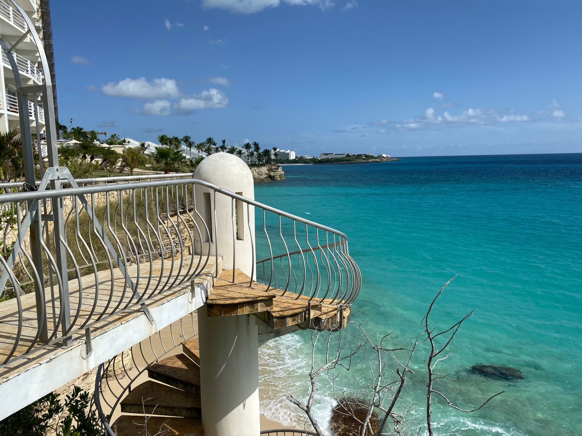 A spiral staircase leads directly down to Cupecoy Beach, where a secluded cave and calm waters invite swimming, snorkeling, or a quiet sunset walk along the shore.