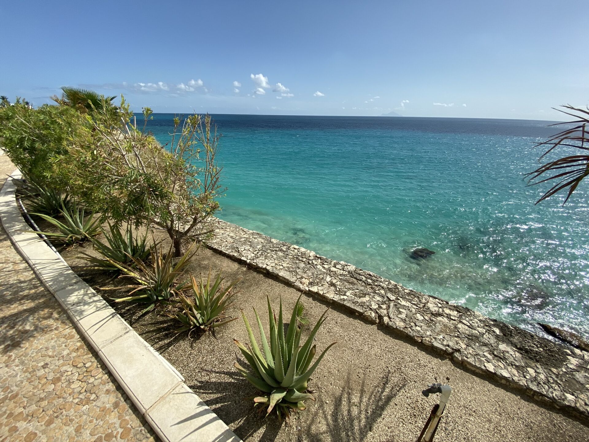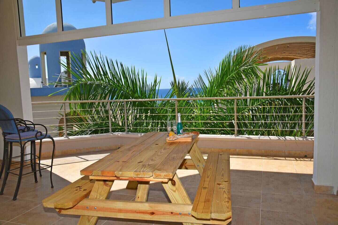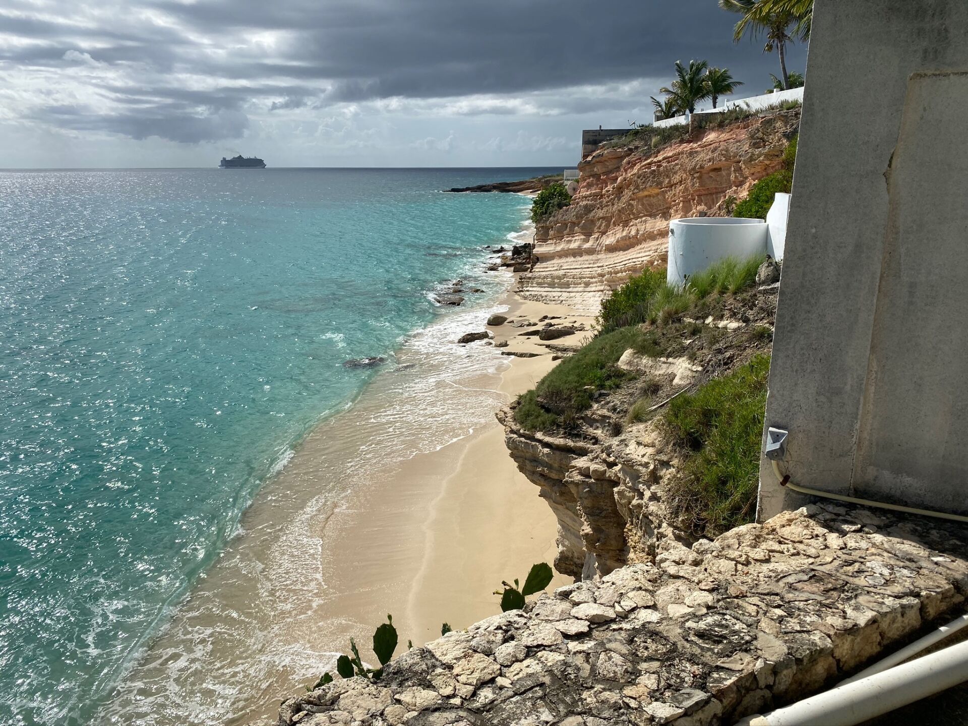 A spiral staircase leads directly down to Cupecoy Beach, where a secluded cave and calm waters invite swimming, snorkeling, or a quiet sunset walk along the shore.