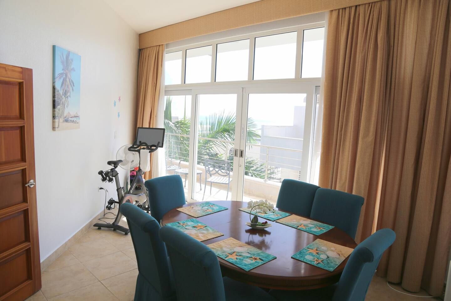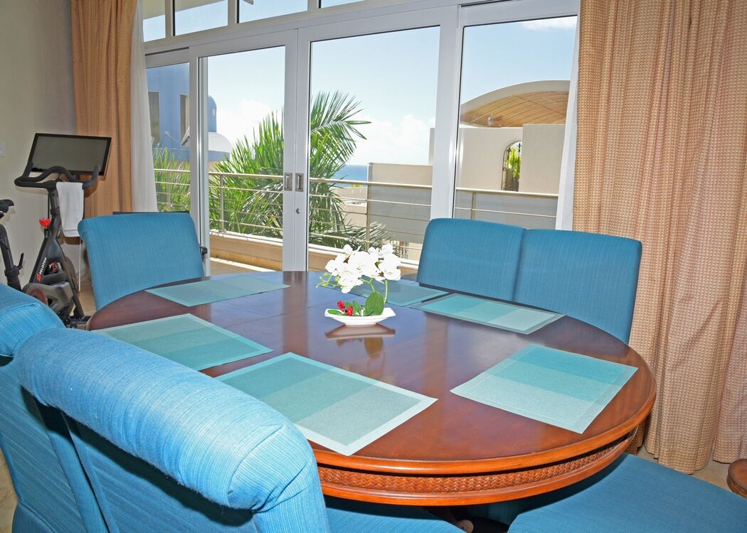 The dining area sits just behind the living room, perfectly positioned to enjoy meals together while looking out toward the ocean. Step onto the balcony and let the view do the rest — mornings feel slower, evenings softer, and every meal a little more special.