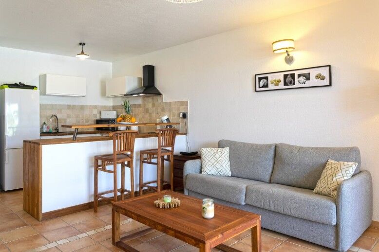 The ground-floor apartment is designed for comfort and relaxation, boasting a bedroom with a wardrobe, a bathroom, a separate toilet, and a living area where you can unwind on a comfy sofa bed in front of a large flat-screen TV. The open kitchen is fully equipped, including a snack area for quick bites. Sliding glass doors open to a spacious terrace overlooking the sea, ideal for dining al fresco or lounging to the soothing sounds of the waves against the backdrop of a tropical garden.