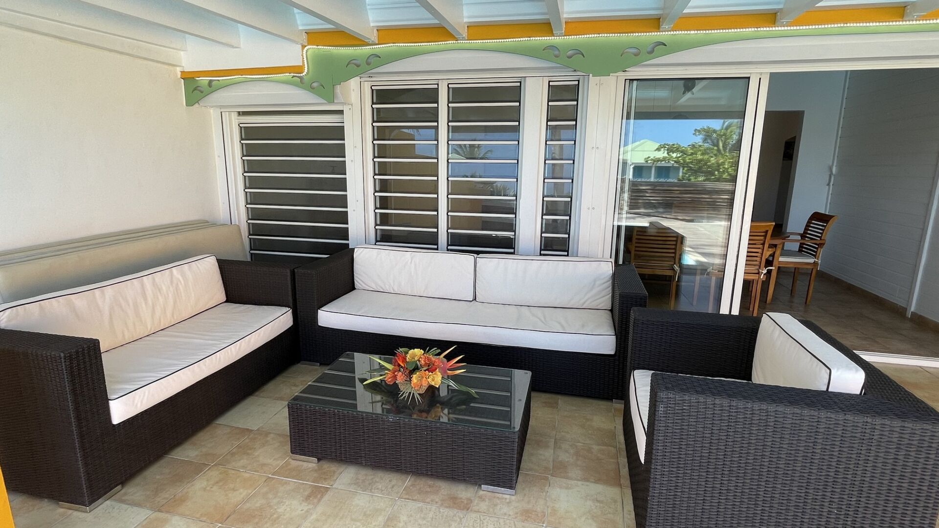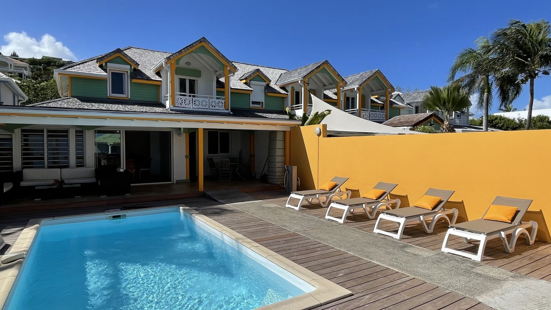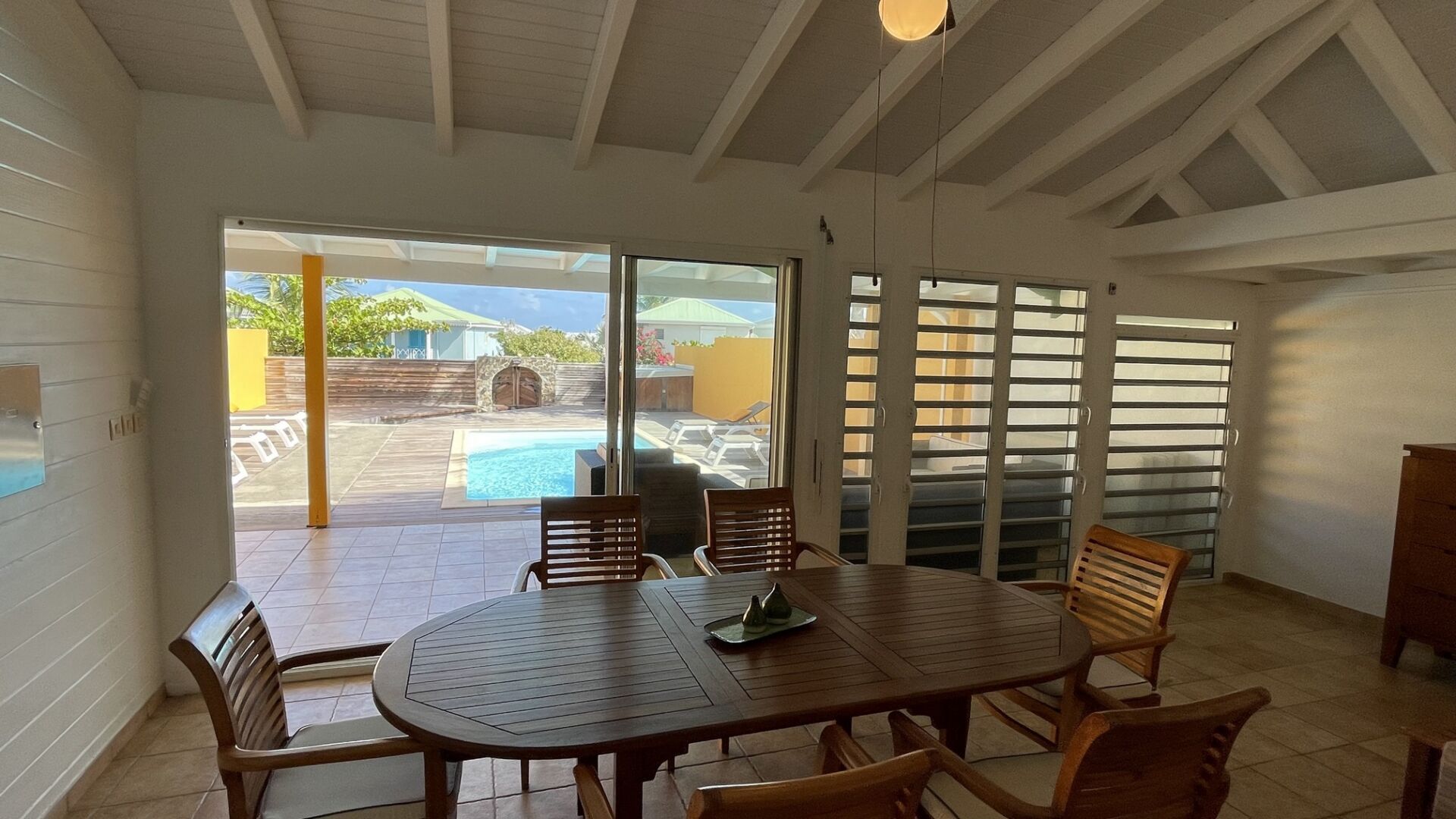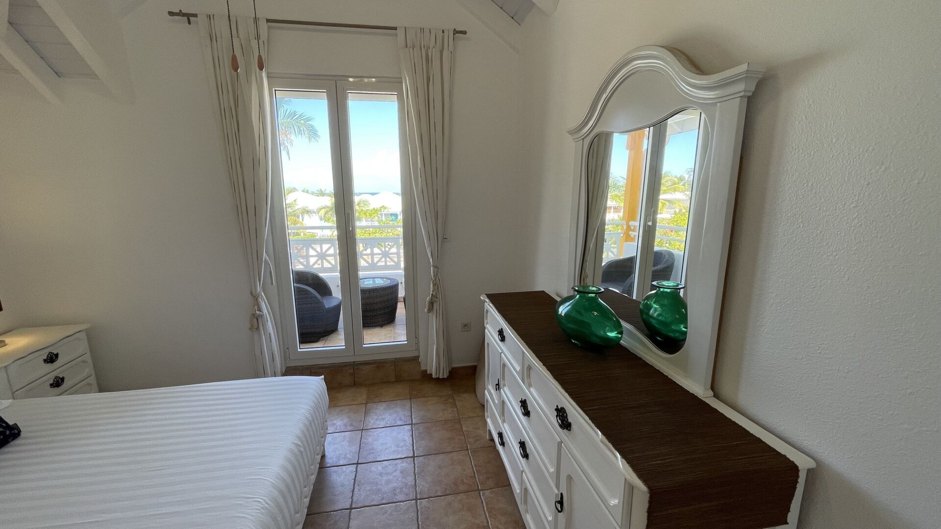 On the ground floor, a bedroom with ensuite bathroom offers easy access and extra privacy, while upstairs, two airy bedrooms share a luminous bathroom and open onto a terrace framed by palm trees. Calm, comfort, and Caribbean ease define the spirit of this home.