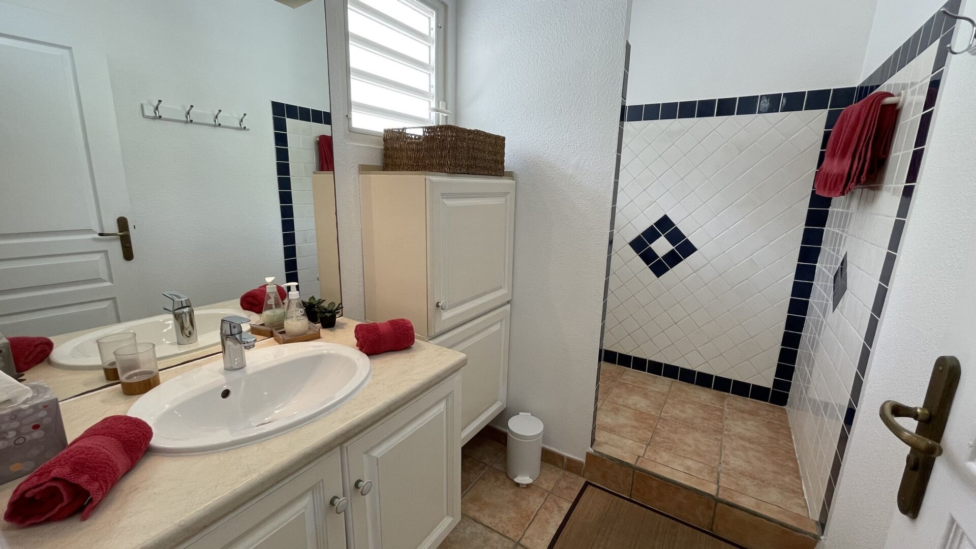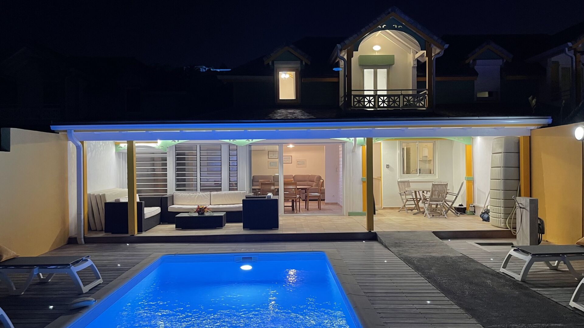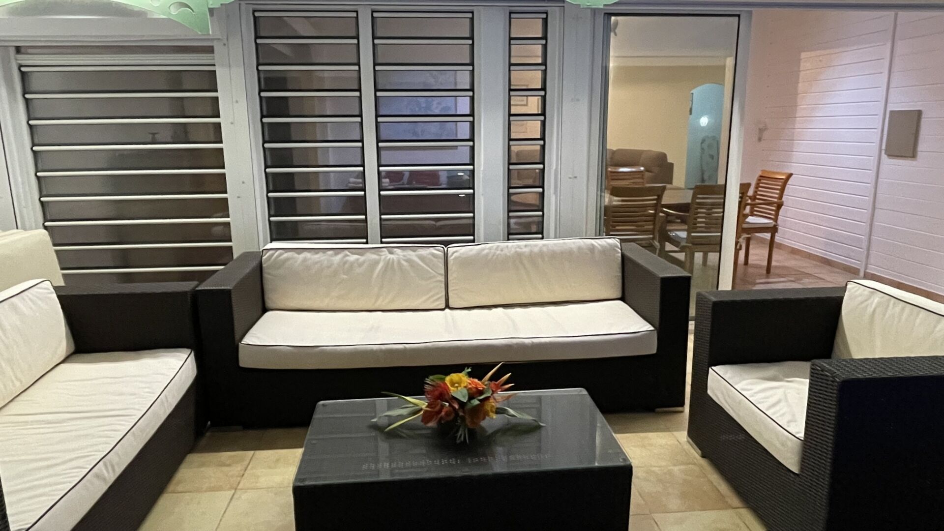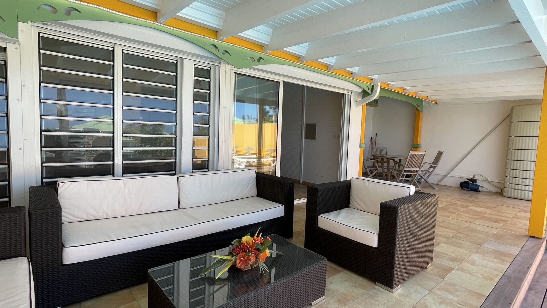 On the ground floor, a bedroom with ensuite bathroom offers easy access and extra privacy, while upstairs, two airy bedrooms share a luminous bathroom and open onto a terrace framed by palm trees. Calm, comfort, and Caribbean ease define the spirit of this home.